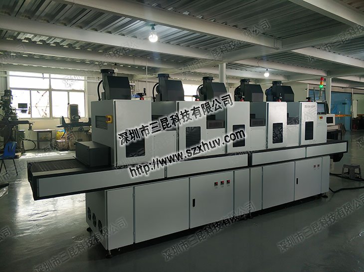UVLE固化機的全方位固化設計。 傳送帶上有四個垂直